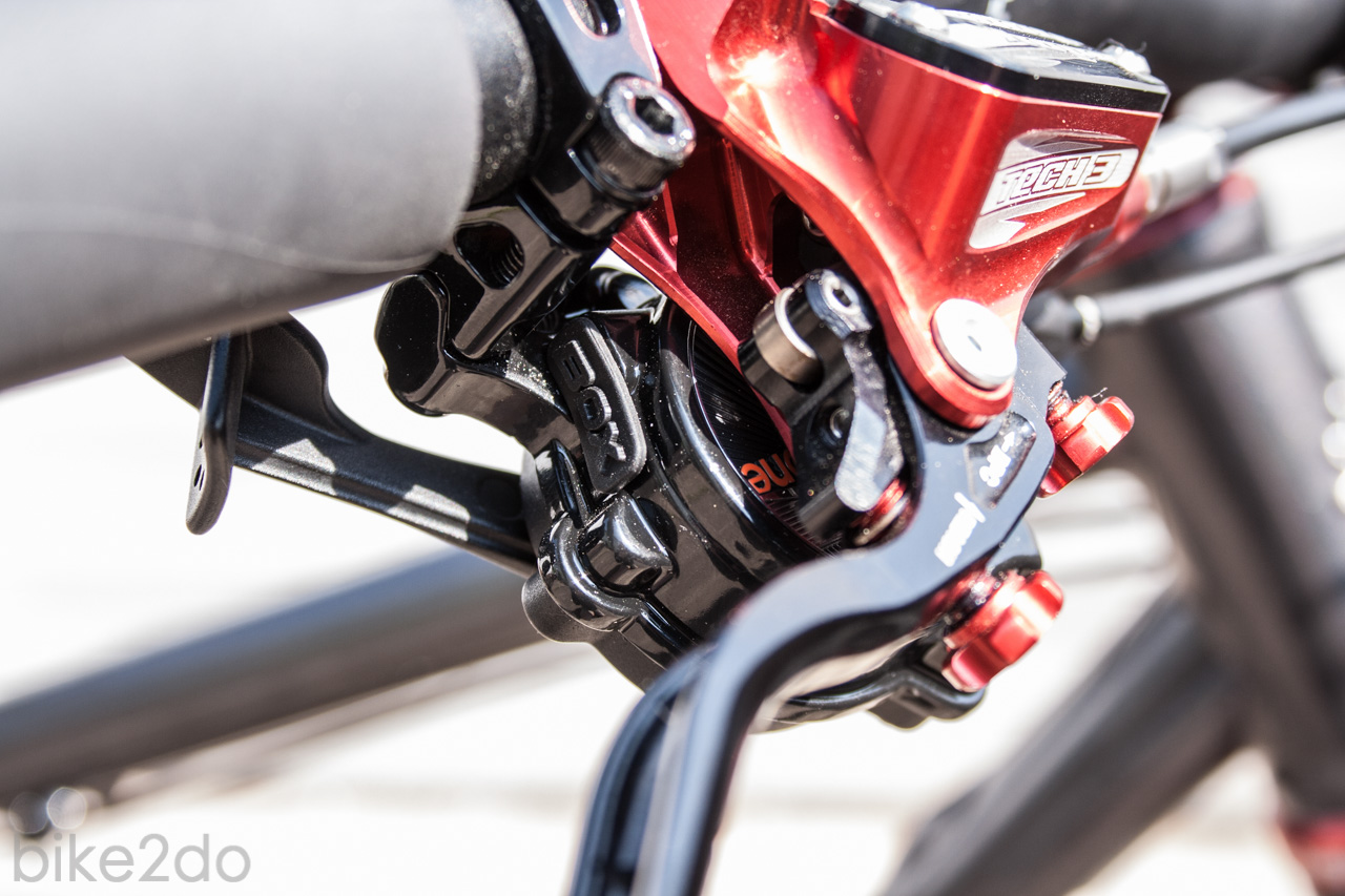 Auf den ersten Testkilometern zeigte sich bereits die größte Herausforderung im Umgang mit den Schaltkomponenten: Die Einstellung der Schalthebelposition am Lenker. Da für beide Schaltvorgänge nur ein Hebel verwendet wird, muss dieser natürlich möglichst einfach in die entsprechenden Richtungen bewegt werden können. Die richtige Hebelposition wird darum auch entscheidend von den persönichen Voraussetzungen abhängen. Aufgrund meiner Handanatomie habe ich mich bei der Montage letztendlich für eine Hebelposition zwischen Bremsehebel und Griff entschieden und habe dabei die Variante der Schelle gewählt, die eher zur Bremse zeigt. Der Schaltgriff ist also rechts neben der Bremse mit möglichst geringem Abstand zu selbiger.