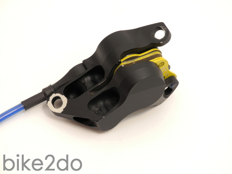 Kurz gesagt ist das neue an dem System vor allem im Bremssattel zu finden. Entgegen aller anderen Hersteller wird dort zusätzlich eine, auf einem Stufenkolben basierende, hydraulische Übersetzung verbaut. In der ersten Stufe, solange die Beläge die Scheibe nicht berühren, fließt das Öl ungehindert durch den Stufenkolben direkt zu den Nehmerkolben. Aufgrund des extrem großen Geberkolbens im Bremshebel, wird ein großes Ölvolumen bewegt und die Pads werden sehr schnell an die Bremsscheibe geführt. Sobald die Beläge anliegen baut sich im Sattel ein Druck auf, welcher den Stufenkolben und damit eine hydraulische Übersetzung aktiviert, und diese zweite Stufe übernimmt die eigentliche Bremskraftverstärkung.