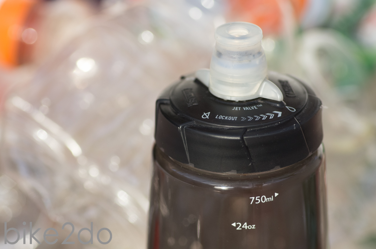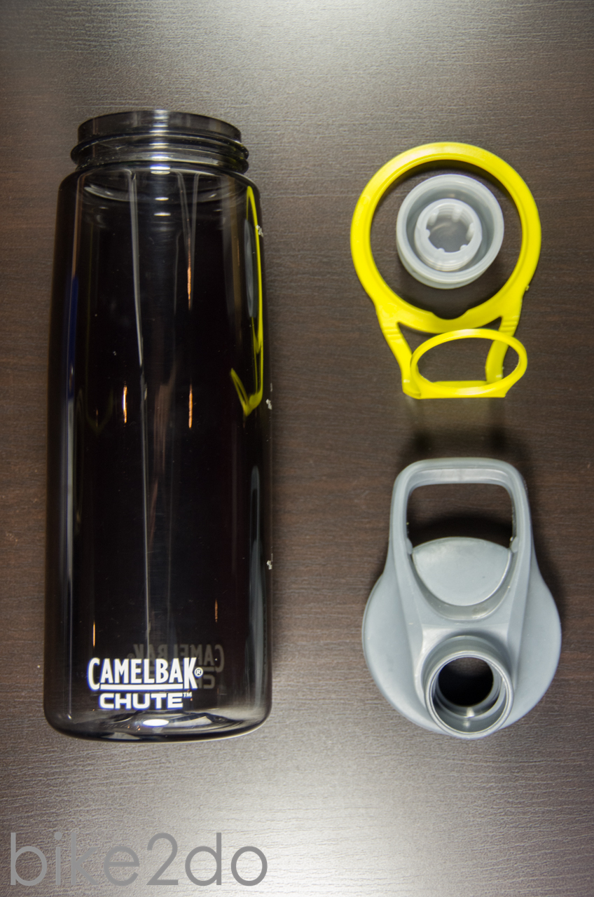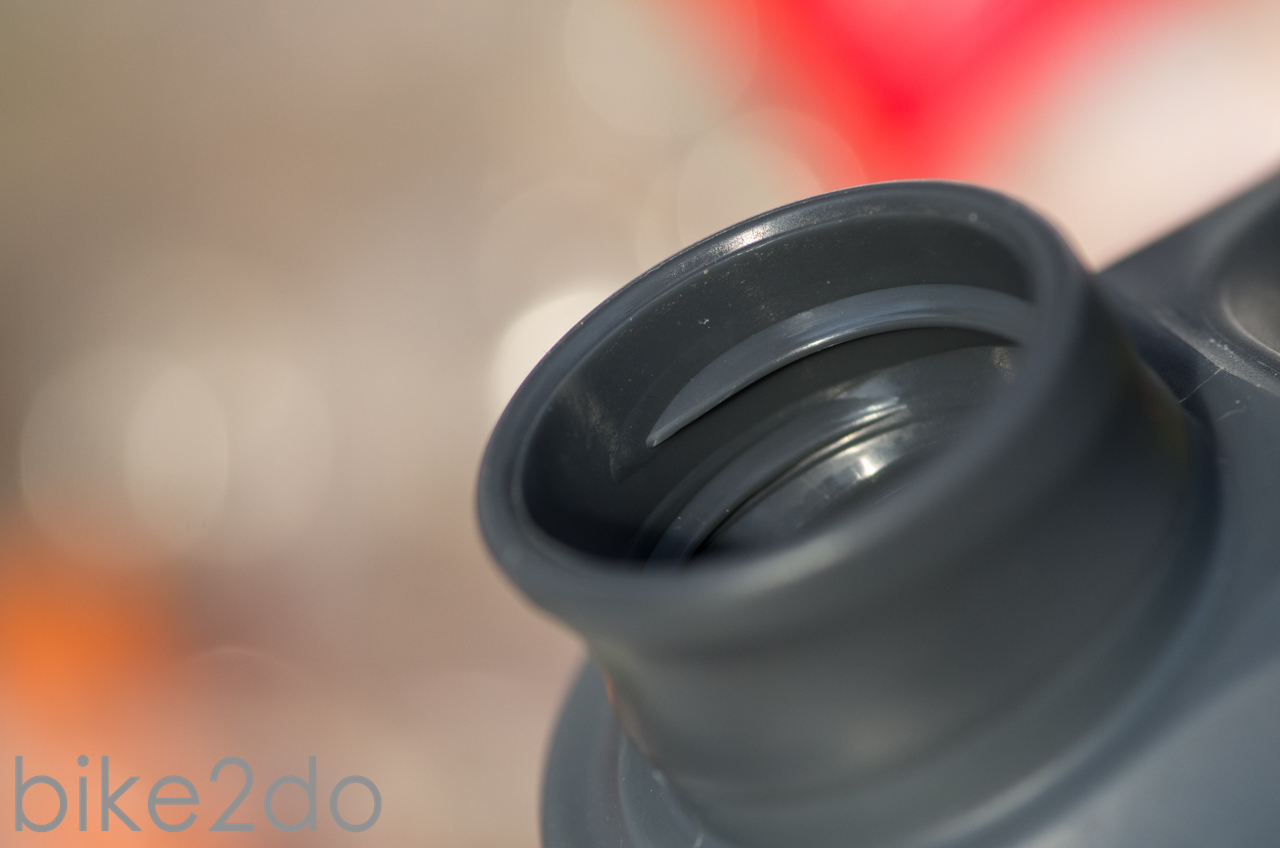 Ist der gesamte Deckel abgeschraubt, erscheint eine große Öffnung, die ein leichtes Befüllen zulässt. Hier gestaltet sich die Reinigung einfach, eine Flaschenbürste zum Schrubben und ein Handtuch zum Trocknen passen easy rein. Die gesamte Flasche besteht aus vier Teilen (Flaschenkörper, Deckel, Verschluss und Lasche), die alle spülmaschinenfest sind. Der Flaschenkörper ist aus Hartplastik gefertigt, wodurch er sich nicht zusammen drücken lässt. Im Vergleich zu einer normalen Fahrrad-Trinkflasche hat die Chute einen etwas größeren Durchmesser. Dadurch kann man die Flasche beim Biken nur in geteilten Flaschenhaltern nutzen, welche sich weit auseinander biegen lassen. Für eine einhändige Nutzung beim Sport lassen sich aber problemlos die Deckel der bekannten Podium Flaschen aus gleichem Hause aufschrauben.