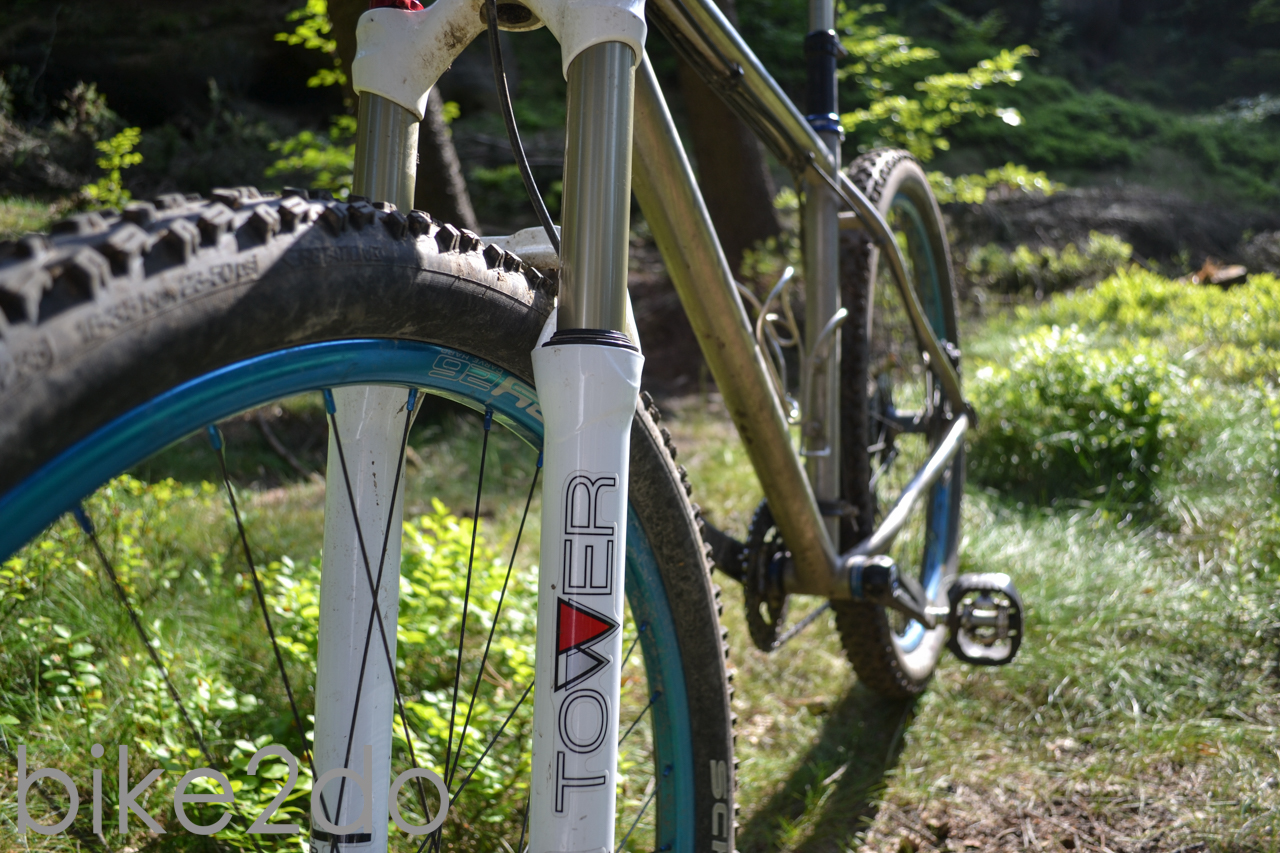 Als 29er ist unser Testmodell ein wahres Trailbike mit 120 mm an der Front und kurzen Kettenstreben von 445 mm Länge. Dadurch kann man das Bike sehr gut mit Speed um die Kurven zirkeln. Durch das kürzere Oberrohr und das relativ tief gesetzte Tretlager sitzt der Reiter zentral auf dem Pferde und man kann es gut in Schräglage bringen. Der Lenkwinkel ist mit 69,5° deutlich abfahrtsorientierter als ein klassisches CC und zeigt mit einem von Sitzwinkel von 73°, dass es sich auf den Trail wohler fühlt als am Anstieg. Der Titanframe ist sehr robust und weißt selbst nach dem ruppigsten und verbocktesten Testfahrten keine Verschleißerscheinung auf. Das Metall glänzt mit einer sehr hohen Zugfestigkeit, was ein Garant für eine besondere Steifigkeit und Langlebigkeit im harten Gelände ist. Weiterhin ist das Gewicht bezogen auf Alu und Stahl viel geringer. Somit ist der Rahmen sehr leicht und enorm steif. Diese Qualitäten fließen dann natürlich auch in die Fahreigenschaften des gesamten Bikes mit ein. Durch die enorme Steifigkeit des Einhorns ist die Geländemaschine enorm linear beschleunigbar, ohne das beim schnellen „reintreten“ Kraft direkt verpufft. Bei dem Laufradsatz handelte es sich um einen eher ungewöhnlichen Custom-Aufbau aus Acros .74 Naben, Di-Light Speichen und Spank Oozy EVO 29er Felgen.Wir können wir auf jedem Fall festhalten, dass sich dieser Spezialaufbau in der Praxis bewährt hat.