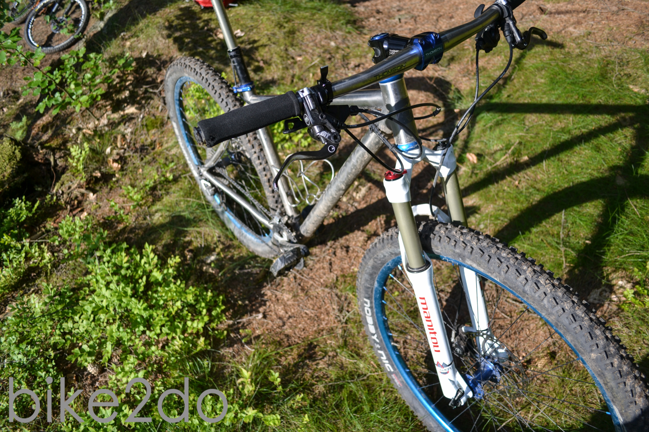 Doch aus dem Test heraus können wir auch einige Hinweise geben. So hätten wir uns am Testbike einen kürzeren Vorbau gewünscht, da so der Reach noch etwas kürzer gewesen wäre und die Lenkbewegung 90° vertikal zum Laufrad verläuft. Denn dadurch wird die Richtungsänderung am Lenker immer genau auf Höhe des Laufrades ausgeführt und nicht schon vorher. Aber auch nach dem Kauf ist ein kostenfreier Wechsel des Vorbaus über Einhorn möglich. Weiterhin hätten wir an dem Bike keine Magura Stopper verbaut, da sich diese enorm unhandlich und schwierig in der Einstellung des Bremskraft zeigten. Auf Nachfrage wurde uns versichert, das auch Shimano XT Bremsen in dieser Preisklasse möglich wären. Die Nobby Nic Schlappen machten hingegen einen guten Job. Alt Bewährtes braucht man ja nicht in den höchsten Tönen wieder Loben. Nicht verschweigen wollen wir euch auch die enorm gut funktionierende Thomsen Elite Dropper Variosattelstüze. Schnelle Ups und Downs der Sattelstütze ohne jegliche Defektanfälligkeit waren das Sahnhäubchen auf den Teststrecken. Auf den verblocken Hometrails blieb das Rad dank 29er sehr laufruhig und linientreu. Ihr könnt bei den „Einhörnern“ eurer Gefährt auch mit 1 1/8 oder Tapered-Steuerrohr und verschiedenen Zugführungsarten, Rohrdurchmessern und diversen Ausfallenden ausstatten. Somit kann jedes Bikerherz das richtige Equipment finden.