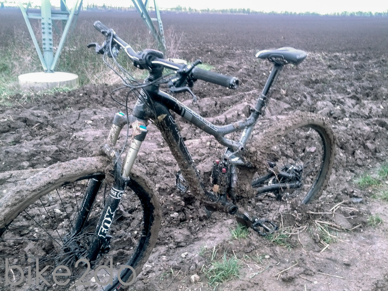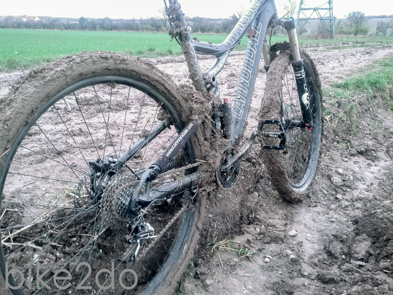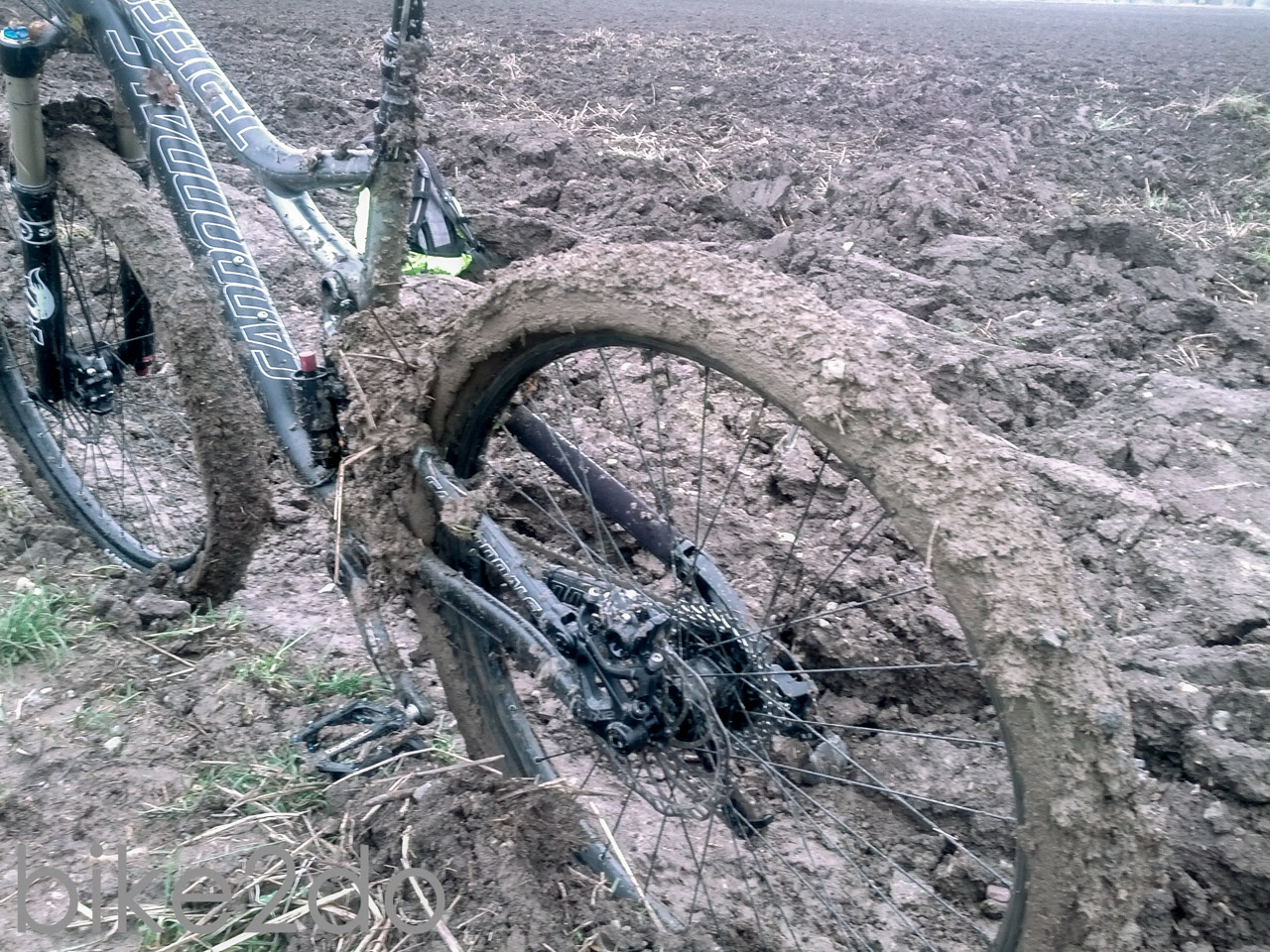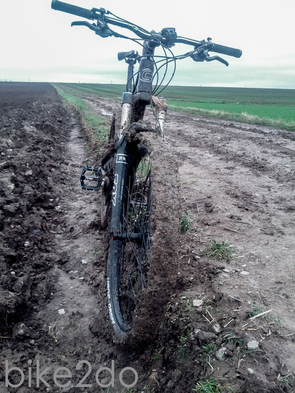 Es war eigentlich ein ganz normaler Samstag Ende November. Ich hatte keine Termine anstehen und freute mich auf eine kleine Tour mit dem Fully. Gesagt, getan. Ich machte mich in die Spur und begab mich in mein Lieblingswaldstück. Abgesehen von kubikmeterweise feuchtem Laub war auch alles schön bis hierhin. Ein paar Dreckspritzer hier und dort, leichter Nieselregen und ein zugiger Wind. Also nichts, dass jemanden vom genussvollen Zweiradsport abhalten würde. Gegen Ende der Tour schlug ich einen mir bekannten Feldweg ein, um nicht den asphaltierten Heimweg fahren zu müssen. Ein fataler Fehler wie sich später herausstellten sollte. Bereits auf den ersten Metern fühlte sich der Untergrund schwer, matschig und zäh an. Das Profil des Hans Dampf Reifens, den ich ja eigentlich sowieso schon nicht mehr fahren wollte, setzte sich in windeseile zu und auch an Rahmen und Gabel zeichneten sich vermehrt Erdklumpenspuren ab. In diesem Moment schossen mir zwei Gedanken durch den Kopf: Entweder ich drehe JETZT um und komme noch einigermaßen sauber und entspannt zu Hause an, ODER ich ziehe die Sache jetzt durch, trete ein bisschen kräftiger in die Pedale und fliege nur so über den Schlammweg hinweg. Selbstredend entschied ich mich für Variante zwei, was sie wiederum als nächster grober Fehler herausstellen sollte. Die Kombination aus Schneeregen der letzten Tage und aufgeweichtem Erdreich erwies sich als unüberwindbares Hindernis. Die Gabel setzte sich dermaßen mit Lehm zu, dass das Vorderrad blockierte und am Hinterbau sah es nicht besser aus. Nur dass sich der Dreck hier bis zum Umwerfer und der Kurbel vorgearbeitet hatte und dort alles lahmlegte. Nachdem ich schon nicht mehr kurbeln konnte trug ich das Rad also bis zum nächsten befestigten Radweg, wo ich die gröbsten Erdreichsedimente vom Rahmen entfernte. Die Reste die trotzdem noch hängen geblieben waren reichten jedoch aus, um den Antrieb derart zu blockieren, dass sich mein Schaltwerk verselbstständigte und nach vorn schoss. Dies führte dazu, dass sich die cage lock Funktion von selbst feststellte und im Endeffekt das Schaltwerk blockiert wurde. Für mich bedeutete das erstmal einen 20 minütigen Fußmarsch nach Hause. Das Rad wog hierbei gefühlte 30 kg. Die Reifen sahen aus wie bei einem Fatbike und überall Lehm,Dreck und Steine.