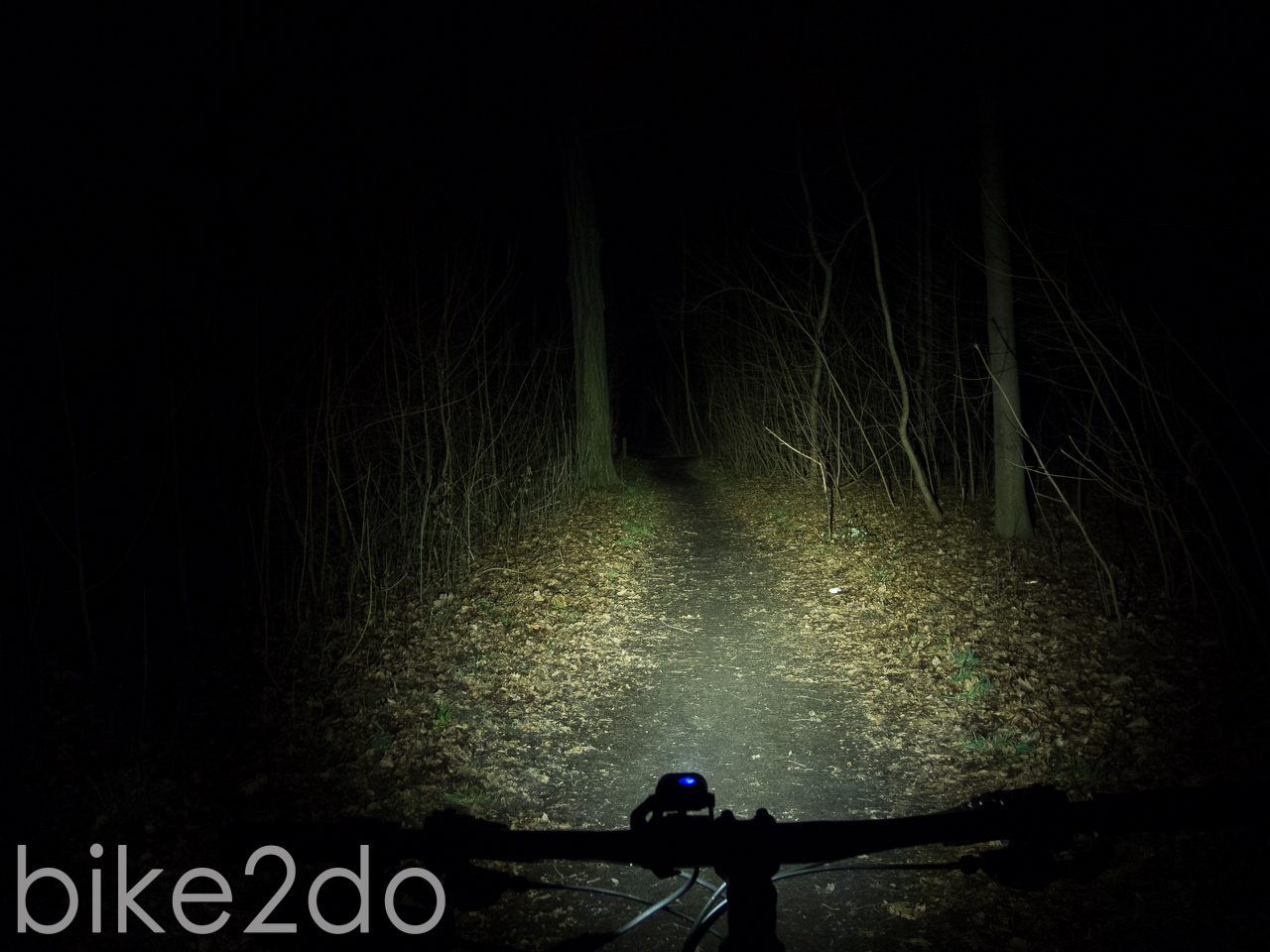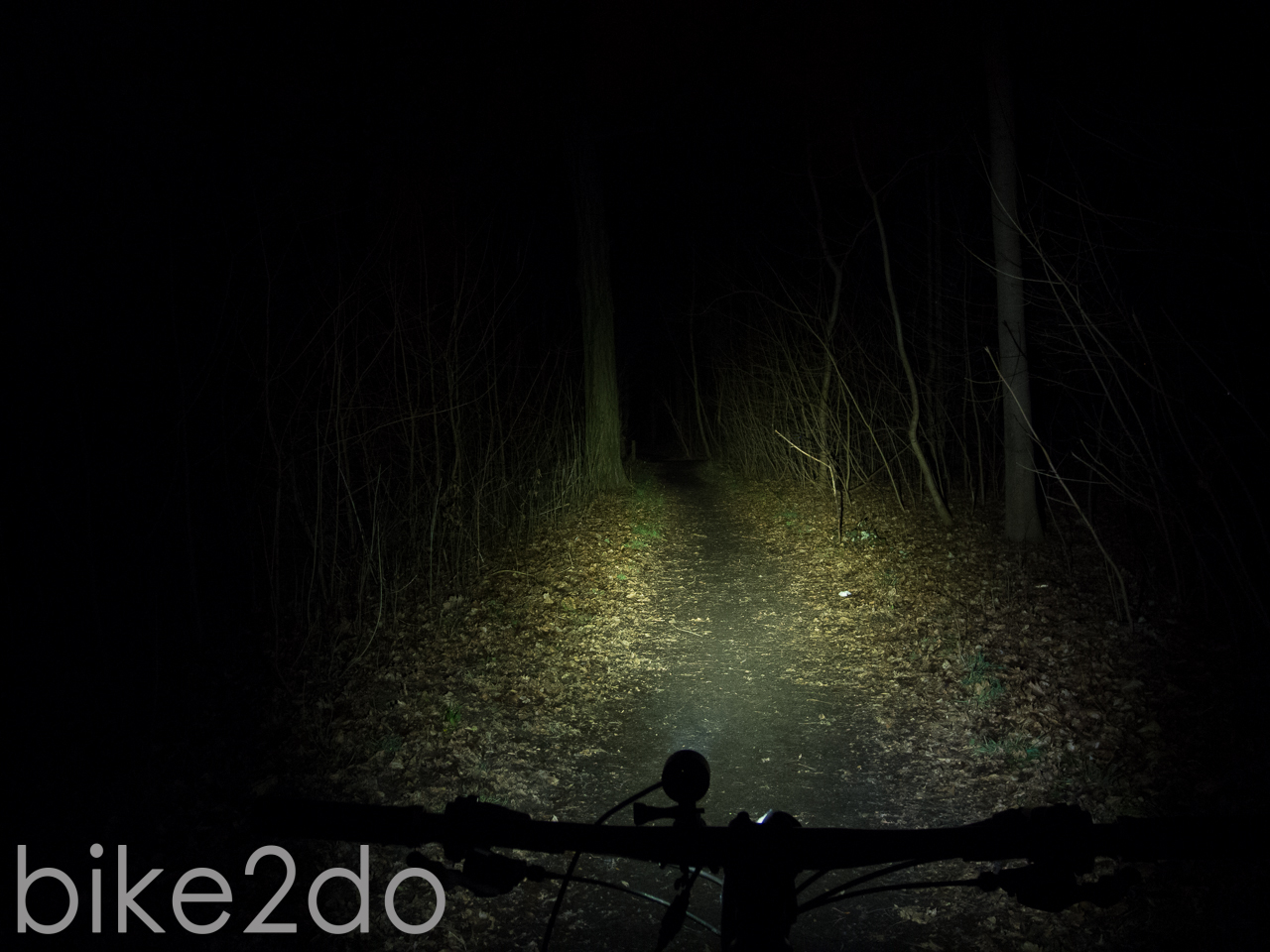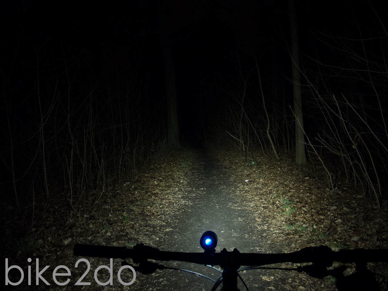 In der Praxis kann die Lampe trotz ihrer drei LEDs nicht mehr ganz überzeugen. Die Lichtausbeute der Cree XP-G Chips ist mit knapp 700 Lumen zwar gut, liegt aber weit unter der Herstellerangabe von 1280 Lumen. Im Wald kann die Leistung aber durchaus noch überzeugen, solang es nicht zu schnell wird und man sich eher auf langsamen Trails befindet. Schon die Spotlinse erzeugt dabei ein sehr homogenes und nur leicht spotiges Lichtfeld; die Streulinse ist in meinen Augen bei der Leistung dieser Lampe nicht nötig. Man darf nicht zu viel von der Lampe erwarten, jedoch sorgt die Adaption des Auges für ein einigermaßen gutes Ergebnis. Nicht ganz optimal ist meiner Meinung nach die bereits erwähnte Halterung. Dabei ist es weniger ein Problem das diese aus Kunststoff ist, sondern das der verwendete Gummi auf der Unterseite der Halterung nur wenig Halt bietet und zum anderen die verbauten Gummiringe sehr weich sind. Dies ergibt eine wacklige Konstruktion welche zusammen mit der Höhe des Aufbaus nicht immer für ausreichend Halt sorgt.