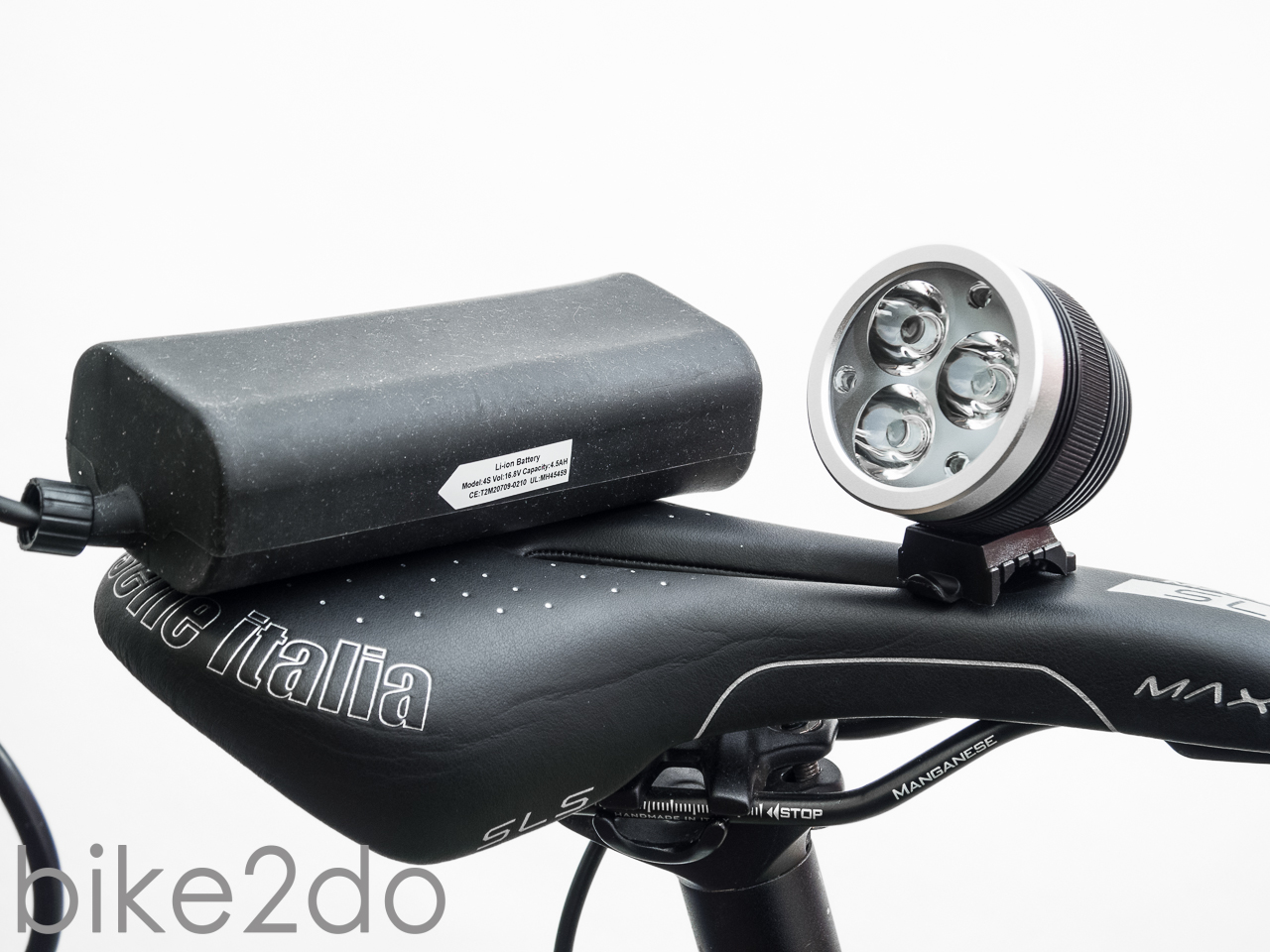 Die Akkus sitzen bei der Volkslicht quer zur Fahrtrichtung direkt hinter dem Lampenkopf. Es handelt sich dabei um zwei einzelne 18650 Zellen, welche dem Besitzer zu mindestens die Wahl geben selbst passende Zellen mit extra Ladegerät zu kaufen. Dafür übernimmt MTS aber keine Gewähr. Im für MTS typisch großen Lampenkopf werden zwei Cree XM-L LEDs verbaut. Damit soll die Lampe nominal 2000 Lumen leisten, im Labor brachten es die zwei LEDs auf über 1400 Lumen. Von den Rohdaten abgesehen will die Leuchte vor allem mit ihren Softskills punkten. Nur sind leider aktuell noch nicht alle Features freigeschaltet. So fehlt z.B. noch die Aktivierung des Lage- und Lichtsensors. Mit dem Lichtsensor ist dann auch eine automatische Abblendfunktion möglich, da er sich genau am Frontschalter befindet. Auch sind allerhand Funktionen für den USB Anschluss der Lampe angedacht, wie z.B. das Anschließen gängiger externer Akkus per Adapterkabel. Informationen welche genau das sein werden finden sich auf der Herstellerseite von MTS. Das Laden von Endgeräten soll darüber hinaus möglich sein.
