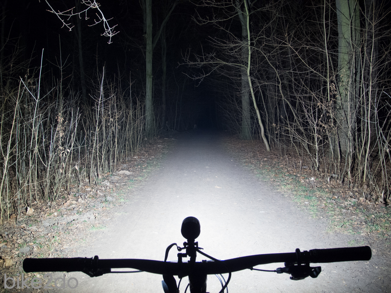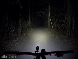 Auf der Lichtseite verfügt die SAPHiR ONE über zwei unterschiedliche Betriebsmodi. Einem normalen Modus mit 5 Leuchtstufen und einem erweiterten Modus, welcher dazu noch Blink- und Notsignalfunktionen bietet. Unabhängig von den Modi kann ein Lichtsensor aktiviert werden, welcher automatisch bei Gegenlicht die LEDs herunter regelt – und das wirklich sehr schnell. Besonderen Gefallen, gerade bei der Nutzung als Helmlampe, fanden wir an der Rücklichtfunktion. Auch wenn die verschiedenen Warnmuster des Rücklichts vielleicht etwas übertrieben sind, das simple rote Rücklicht ist doch immer noch das Beste. Die Grundbedienung der Lampe ist dabei einfach, nur wer tiefer in die Betriebsmodi gehen will braucht mal das Handbuch, welches dafür aber wirklich gut ist. Ein Fakt den man nur selten anspricht, aber Handbücher werden von einigen anderen Herstellern im Test wirklich sehr stiefmütterlich gehandhabt. Im normalen Betrieb wird die Lampe über den rechten Knopf eingeschaltet, über den linken kann man seine gewünschte maximale Helligkeit einstellen. Mit dem rechten Schalter wechselt man dann immer zwischen dieser gewählten max. Helligkeit und dem Abblendlicht hin und her. Simpel und praxistauglich. Die beiden Schalter sind dabei auch mit dicken Winterhandschuhen gut bedienbar und geben ein gutes Feedback. Als nachteilig zeigte sich die nur mit der rechten Hand mögliche Bedienung am Helm, denn in einer unvorhersehbaren Situation hat man dann nur noch die Vorderradbremse in der Hand. Auf dem Trail fällt vor allem sofort die kalt-weiße Farbtemperatur der OSRAM LEDs ins Auge. Die 15 Grad Linse holt aus der geringen Leistung eine gute Leuchtweite heraus, jedoch natürlich auf Kosten der Randausleuchtung. Der Kegel ist durch seinen scharfen Mittelbereich eher als spottig zu bezeichnen. Es ist aber bei weitem noch nicht so schlimm wie bei einigen asiatischen Modellen, bei denen in der Mitte ja im Grunde nur ein Punkt erkennbar ist. Die Linse schafft es mit dem hellen Mittelbereich problemlos einen 2 – 3 Meter breiten Waldweg auszuleuchten, kann aber an dieser Stelle nicht mit der Konkurrenz mithalten.