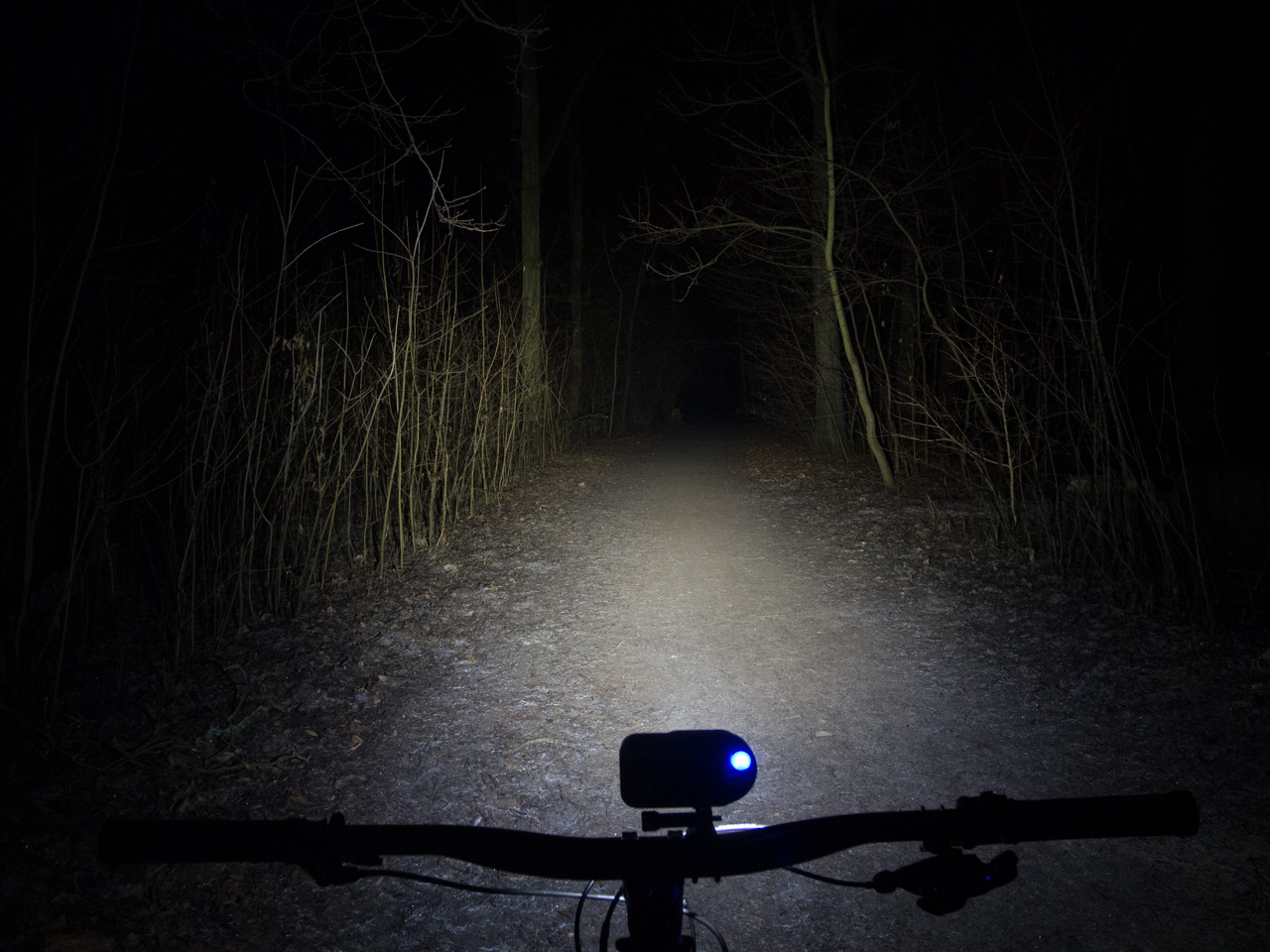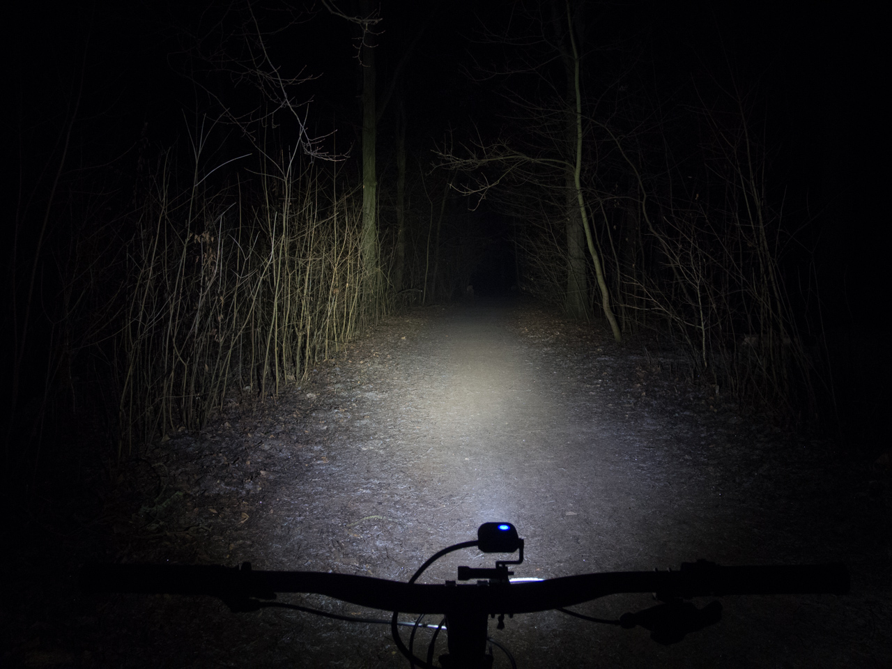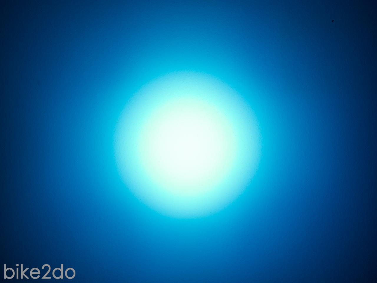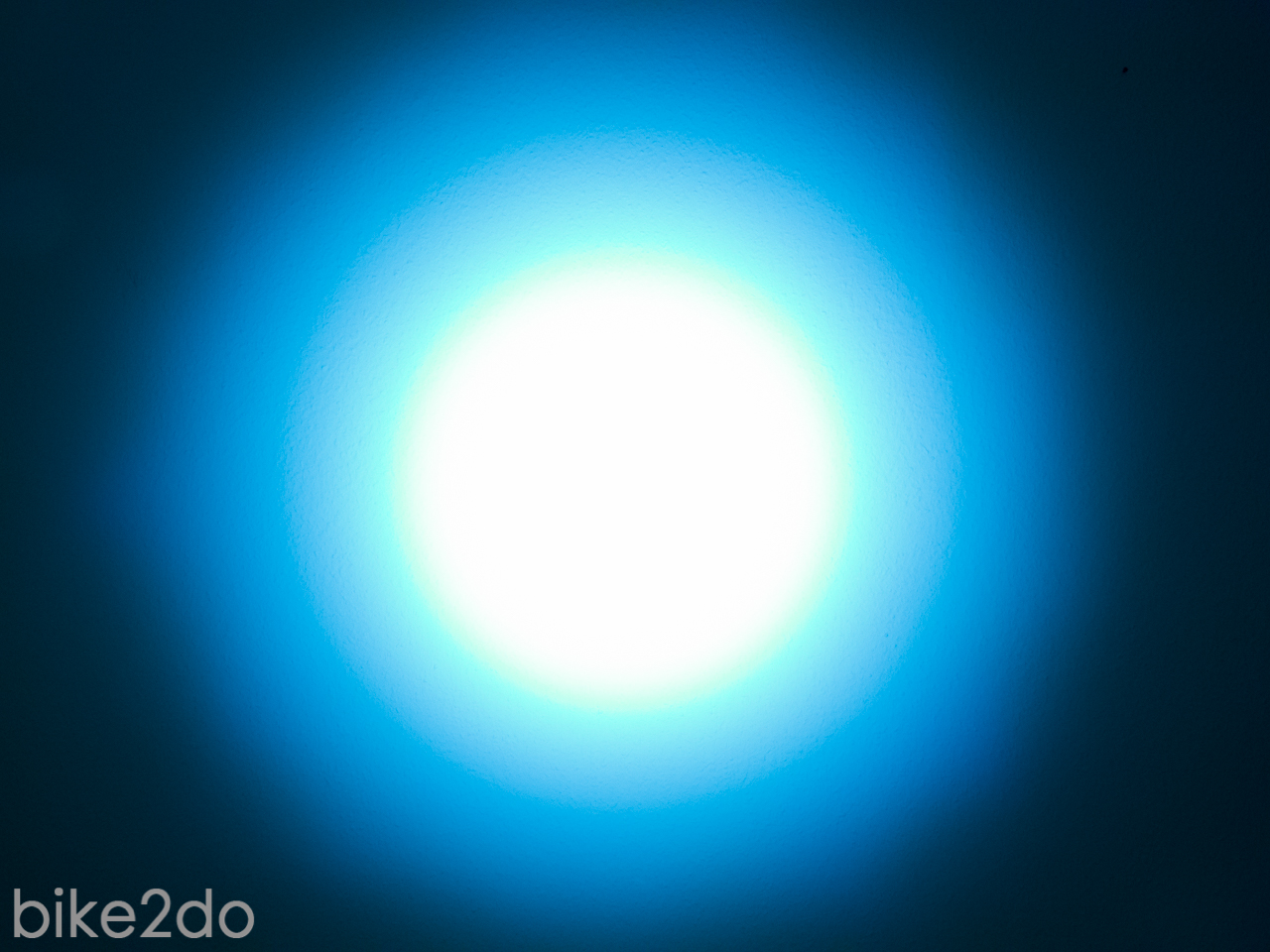 Hat man sich nach ein paar Ausfahrten an die Bedienung gewöhnt, kann die Lampe aus technischer Sicht durchaus überzeugen. Die 920 bis 1700 Lumen machen auf dem Trail einen guten Job. Die Optik zeigt im Flutlichtmodus eine harte Lichtkante. Die Weite des Lichtkegels liegt in etwa auf dem Niveau einer Lupine Piko. In Kombination mit einem leichten Spot auf der anderen LED ergibt sich ein schönes Leuchtbild mit guter Randausleuchtung und ausreichend Leuchtweite. Alles in allem völlig praxistauglich.