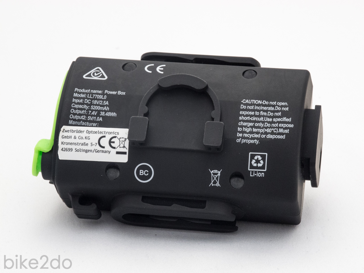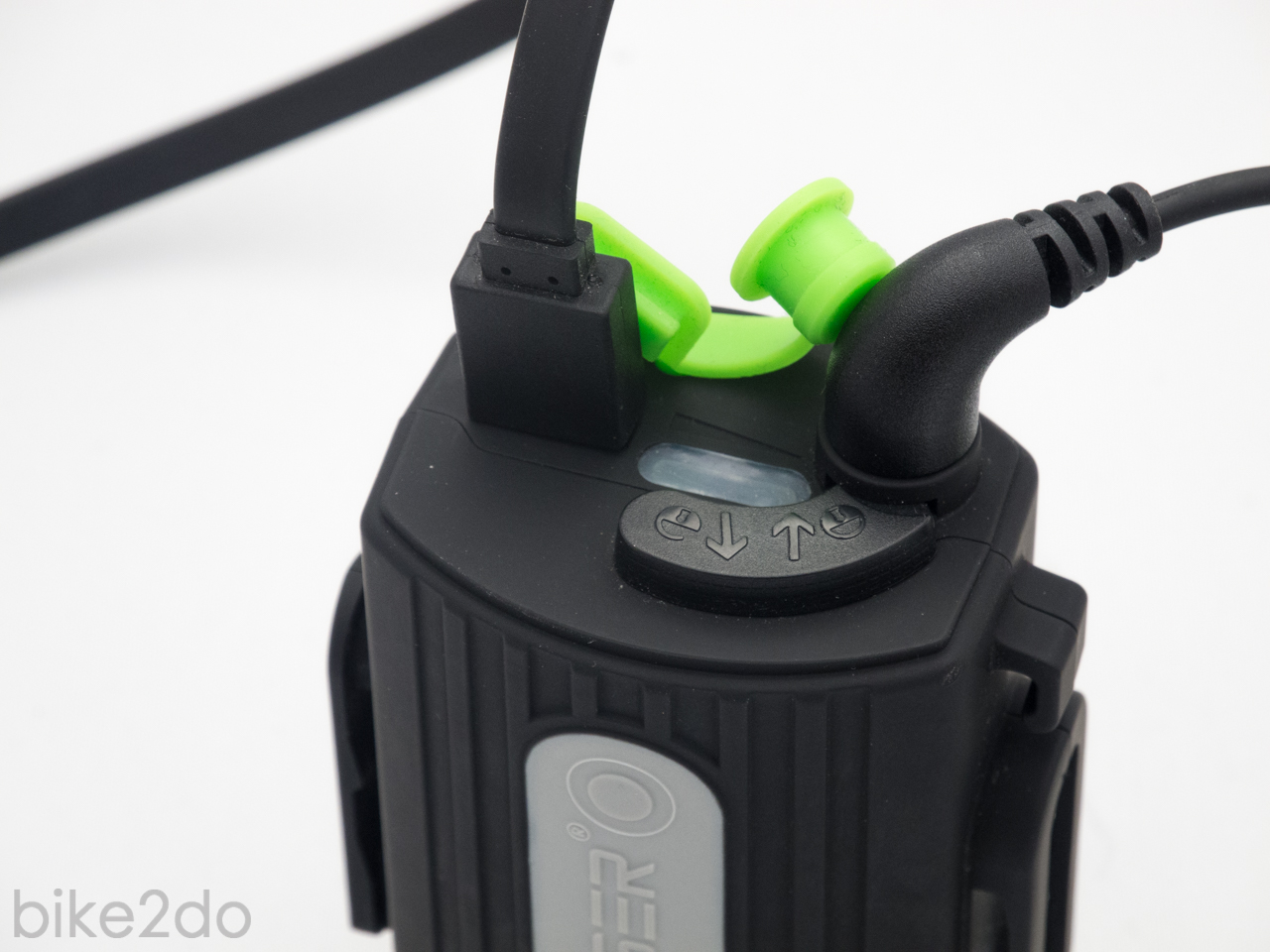 Der Akku bietet 38,5 Wh (7,4 V / 5200 mAh) und ist als 4-Zellen Akku ausgelegt. Das bedingt natürlich auch ein nicht ganz unerhebliches Gewicht, welches unserer Meinung nach nicht mehr für die Montage am Helm geeignet ist. Als lobenswertes und zeitgemäßes Feature bietet der Akku einen USB Anschluss, der mit bis zu 1 A Ladestrom arbeitet. Es lässt sich also neben dem Betrieb der Lampe auch noch das Navi oder das Smartphone aufladen – Top! Der Akku verfügt über einen etwas verstecken Taster im LED Lenser Logo, mit der sich die Ladestandsanzeige aktivieren lässt und zudem der USB Port an- und abgeschaltet werden kann.