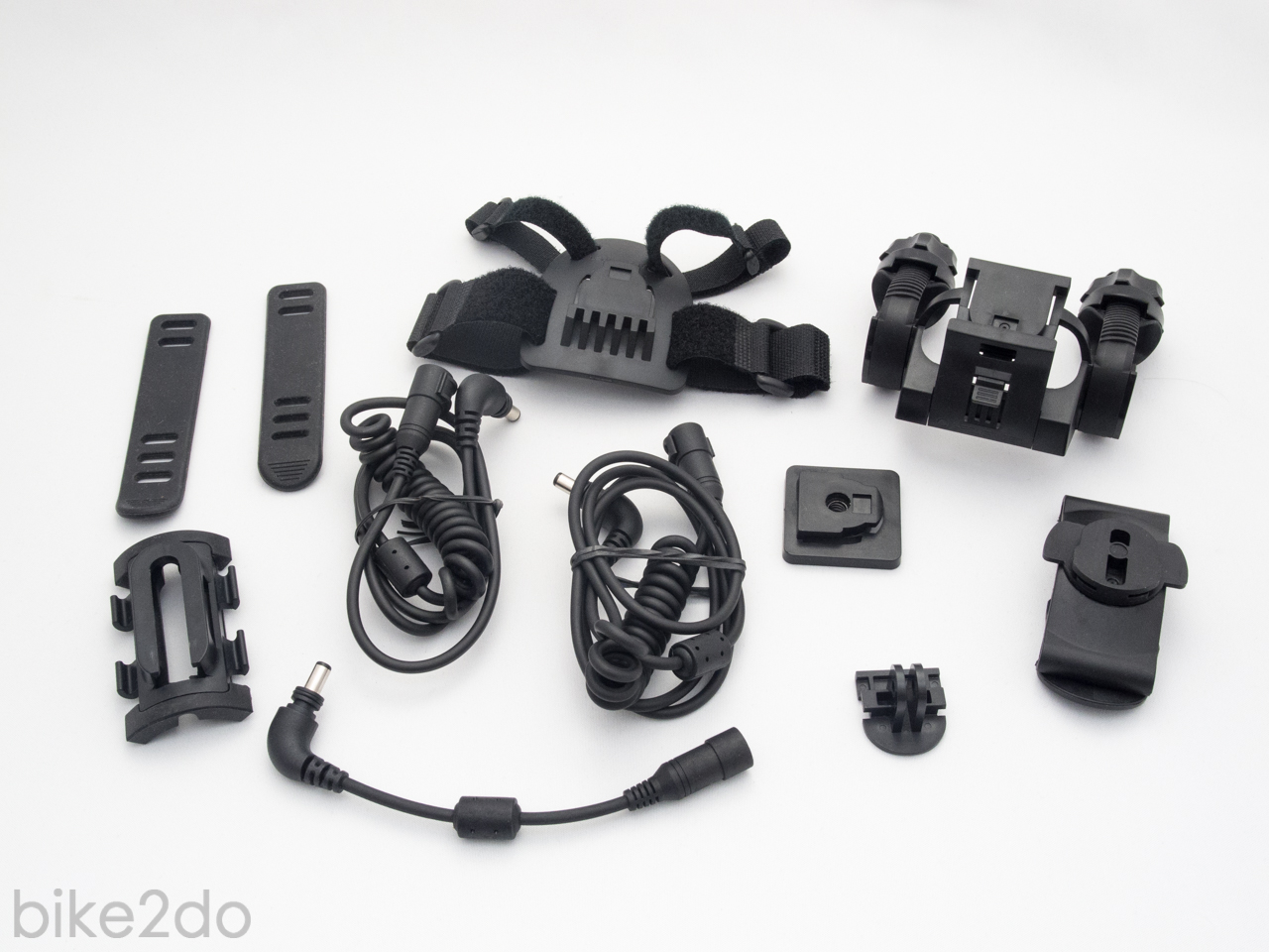 Der Lampenkopf selbst verfügt an der Rückseite über eine nicht abnehmbare Montageplatte, deren Winkel sich in sieben Stufen verstellen lässt. Von dieser Montageplatte ausgehend lässt sich die XEO 19R mit dem umfangreichen Zubehör verbinden. Dabei sind die Möglichkeiten so zahlreich, dass man vom „Schweizer Taschenmesser“ der Outdoor-Lampen sprechen kann. So verfügt das Paket über eine Lenkerhalterung, eine Helmhalterung mit Klettbändern oder Klebepad und einen GoPro bzw. Stativ Adapter (aktuell wird die Lampe zudem ab Werk mit einer Kopfhalterung ausgeliefert). Zusätzlich kann der Lampenkopf auch direkt mit dem Akku verbunden und so als Taschenlampe genutzt werden. Für den Akku selbst gibt’s dann noch eine Rohrhalterung, eine Neoprentasche und eine Hosen- bzw. Gürtelhalterung. So einen umfangreichen Lieferumfang gibt es sonst bei keiner anderen Lampe. Und dazu steckt das alles noch in einer schönen Aufbewahrungstasche wie bei Lupine.