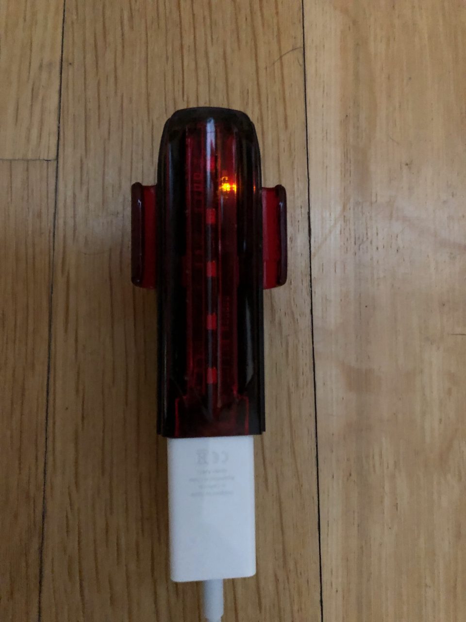 Auf der Suche nach der Akkuanzeige musste ich tatsächlich noch einmal die Verpackung in die Hand nehmen, denn auf Anhieb habe ich sie schlichtweg nicht gefunden. Selbst nachdem ich wusste wo sie sich befindet, war deren Funktion jedoch insgesamt enttäuschend. Lediglich die kleine, vom Aufladen bekannte LED im oberen Bereich des Rücklichtes leuchtet dauerhaft gelb auf, wenn das Licht voll geladen ist. Die selbe LED leuchtet, wenn sie eben nicht mehr voll ist und man den Einschalter nur kurz betätigt. Eine rote LED kommt schließlich zum Vorschein, wenn es dem Ende der Akkulaufzeit entgegen geht. Wie der Akkustand der Leuchte tatsächlich ist, konnte ich jedoch nicht erfahren, außer wenn sie voll geladen war.