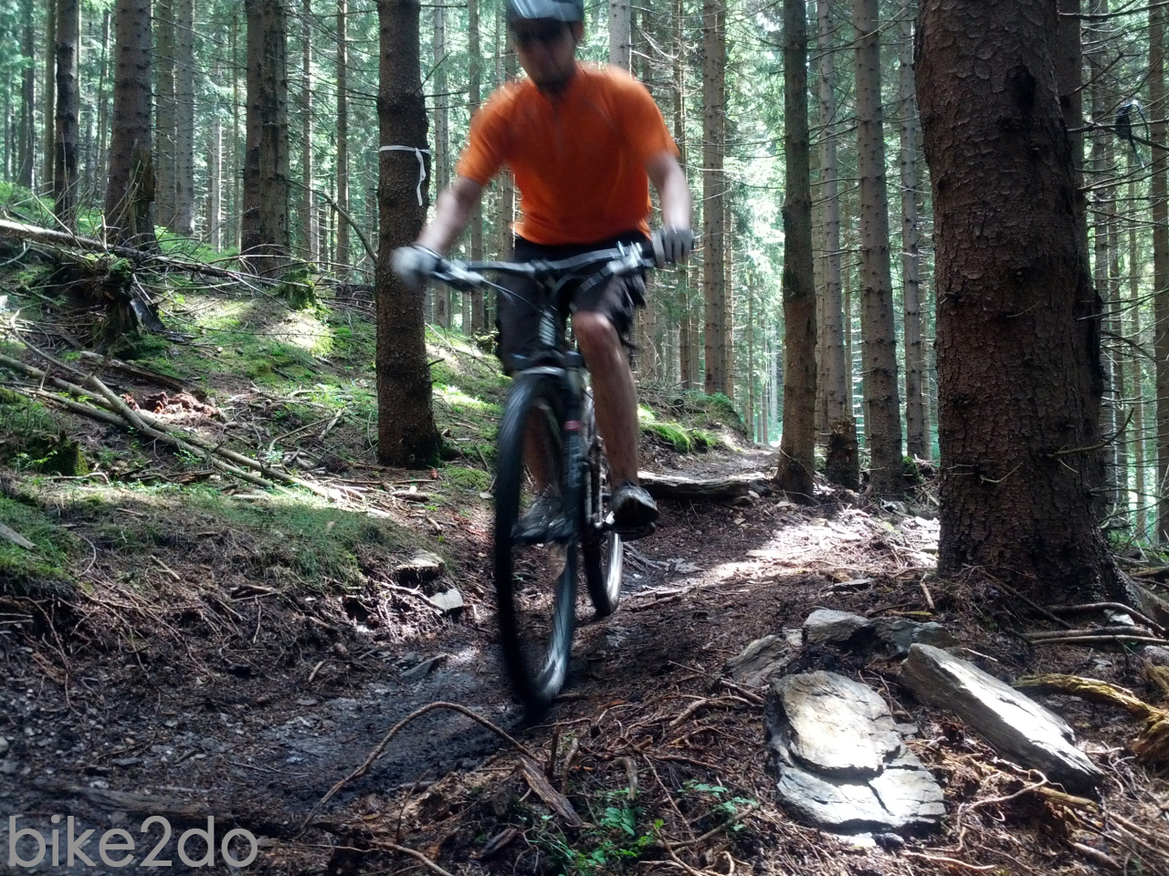 Nachdem alles soweit vorbereitet war, bekamen wir noch unsere Karten mit den einzelnen Routen. Gut gekennzeichnet und schön zu sehen war, dass verschiedene Schwierigkeitsgrade der Trails angegeben waren, ebenso wie die Gesamtlänge der Trails sowie die der einzelnen Teilabschnitte. Auch Abkürzungen und Waldwege waren deutlich gekennzeichnet und erleichterten uns somit die Orientierung. Auch auf den Trails selbst waren jeweils entsprechende Wegmarkierungen zu finden. Sehr erfreulich war zudem die „Einbahnstrassenführung“, sodass einem auf dem Trail nicht plötzlich potentieller Gegenverkehr den Flow oder die Abfahrtsfreude nimmt.