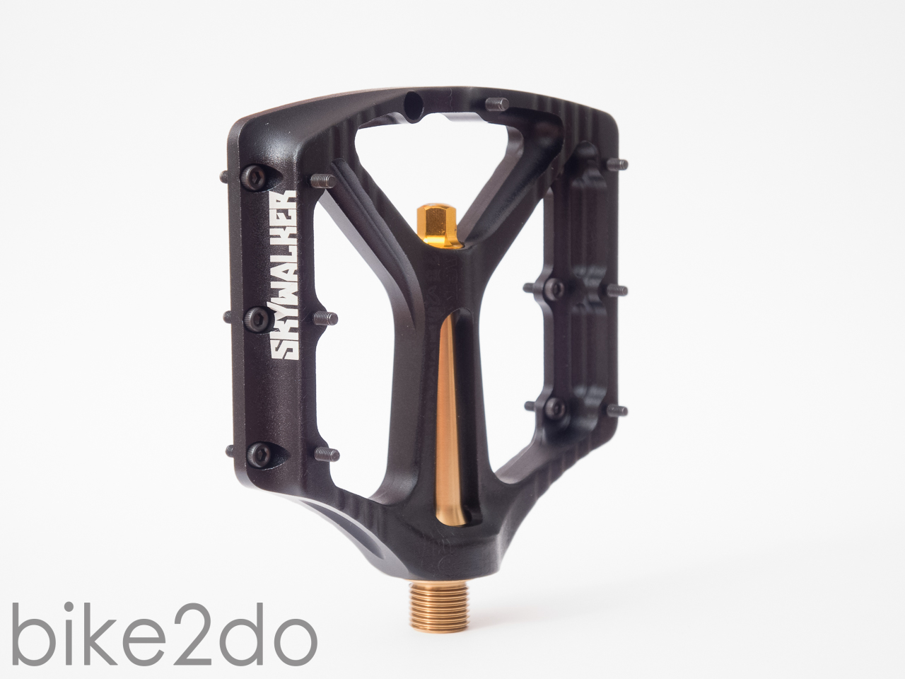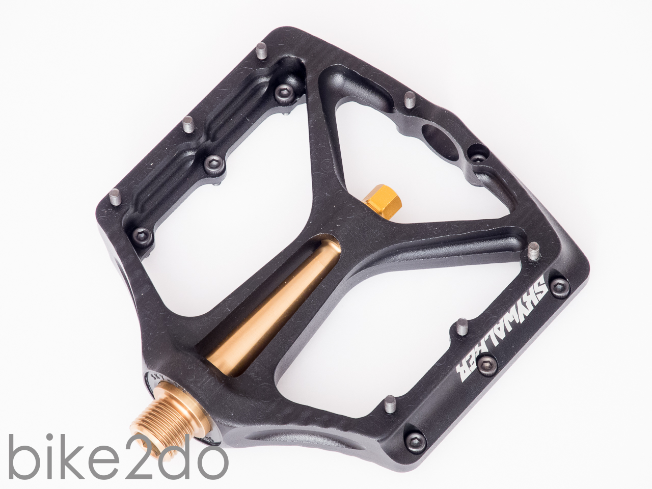 In der Hand macht dann vor allem der filigran gearbeitete Pedalkörper echt was her. Der CNC gefräste Aluminiumkörper ist nicht nur sehr sauber ausgearbeitet, sondern auch sehr gut lackiert. Dass man das Pedal dann per Lasergravur quasi noch tätowiert hat, zeugt von viel Liebe zum Detail. Das konkave und nur 15 mm dicke Skywalkerpedal bietet auf jeder Seite sieben M3 Imbus-Pins, welche jeweils von hinten verschraubt werden. Schon in der Hand bekommt man auf eine subtile Art und Weise Respekt vor dem zu erwartenden Grip der über 4 mm langen Pins. Mit 110*110 mm Aufstandsfläche ist auch für große Füße genug Platz und die Waage wird in der Titan-Version mit gerade einmal 326 g belastet. In der 100 € günstigeren Version mit CrMo Achse sind es gerade einmal 50 g mehr.