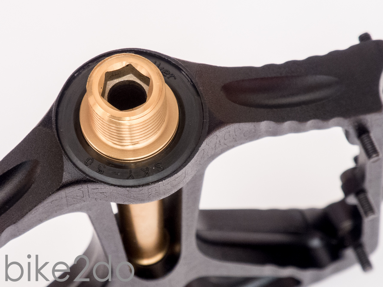Entgegen der gängigen Praxis kommen beim Sixpack Skywalker keine Gleitlager zum Einsatz. Am vergleichsweise voluminösen Anschlussbereich zur Kurbel befindet sich ein großes abgedichtetes Rillenkugellager, welches vor allem die hohen Achsmomente aufnimmt. An der Spitze der Achse befinden sich dann zwei kleine abgedichtete Kugellager mit einer außenliegenden Vorspannschraube.