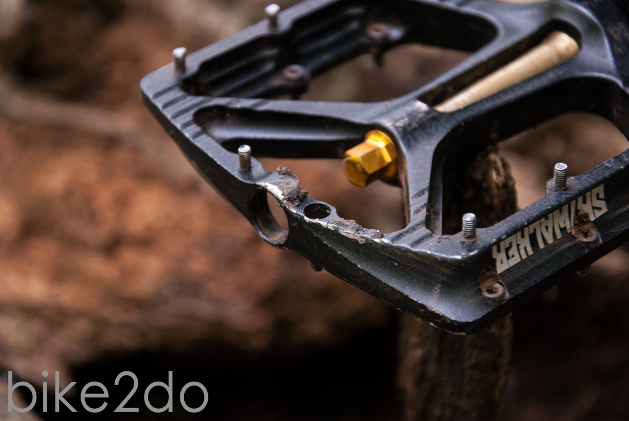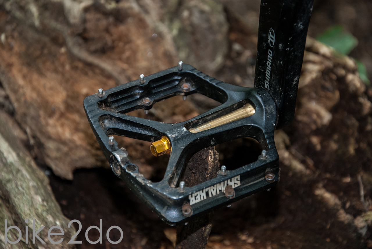 Bei den Pins kommen M3 Vollschrauben zum Einsatz. Zwar werden diese von hinten verschraubt, was den Zugang bei einer Beschädigung vereinfacht, sollten sie aber verbogen sein müssen sie erst knapp über den Padalkörper abgetrennt werden. Hier wären hohle Pins nicht nur besser fürs Gewicht, sondern sie würden auch abbrechen, was das Wechseln der Pins vereinfacht.
