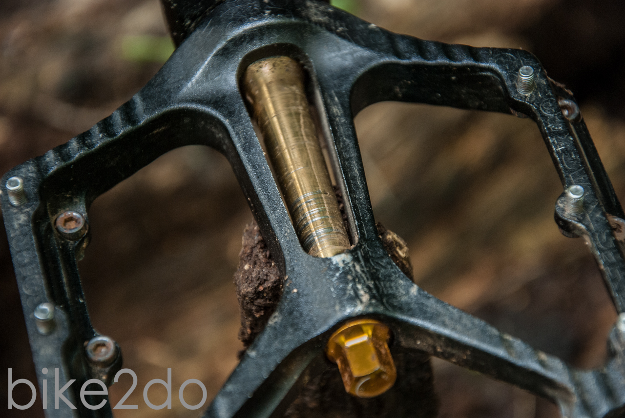Mit großen Öffnungen in der Pedalfläche ist Matsch kein Problem. Die offene Achse hat dagegen aber kaum Möglichkeiten ihren Dreck los zu werden. Wie sich das in der Praxis niederschlägt sehen wir später.