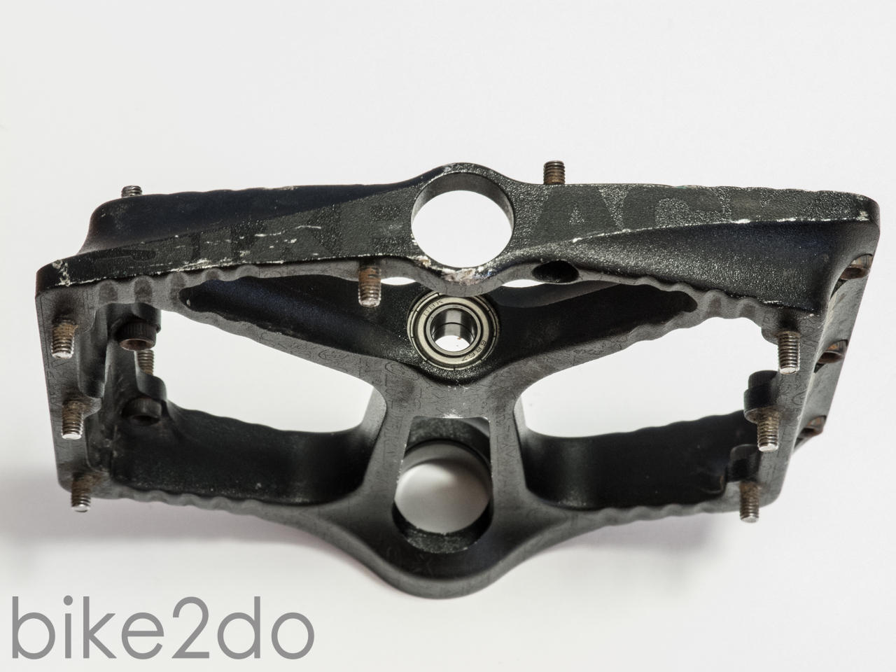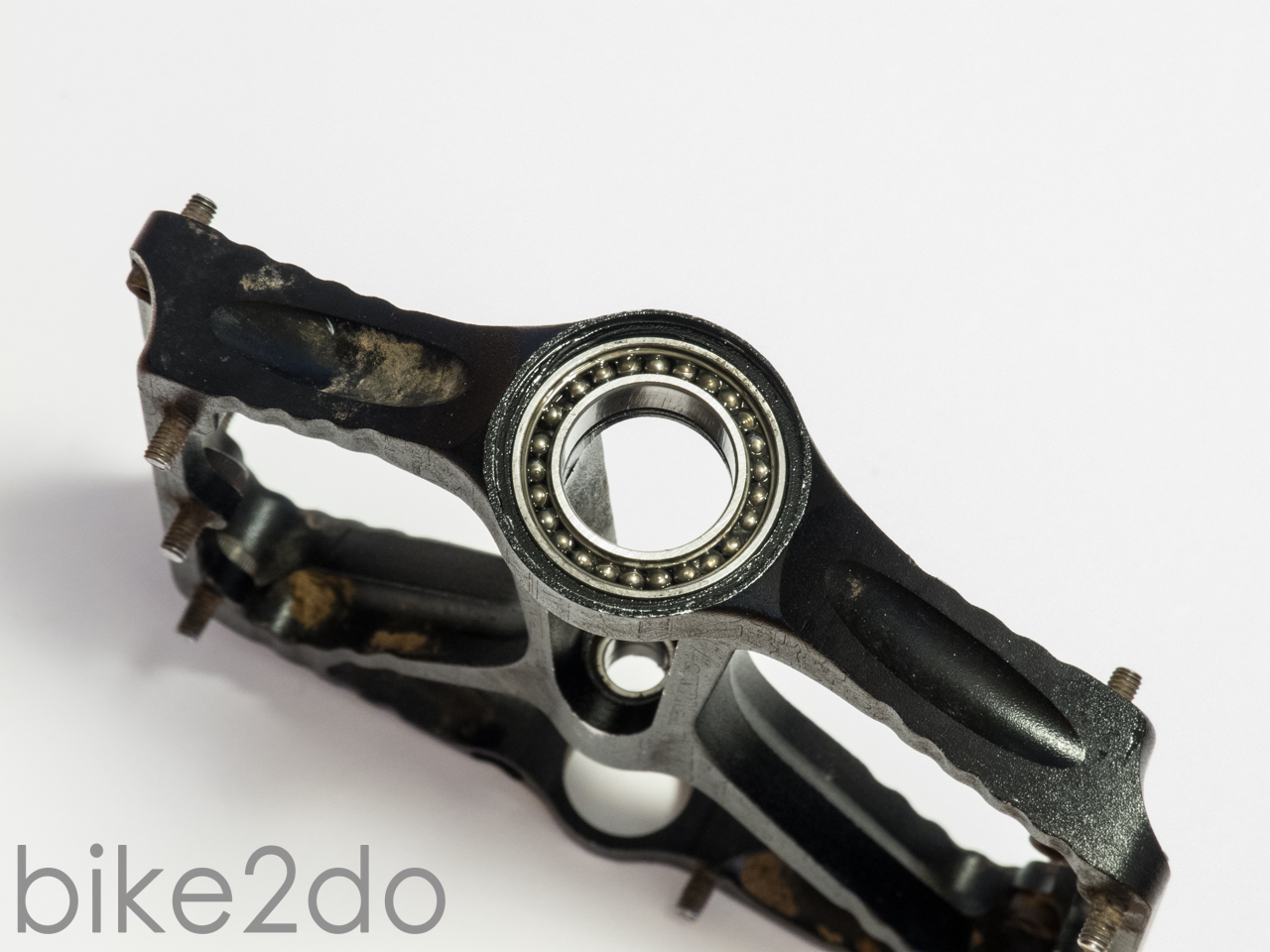 Nach etlichen Monaten im Einsatz gaben wir den Skywalkern unter unseren Füßen keine Ruhe. Sandige Trails, Schlammschlacht oder unter Tage mit feinem Steinmehl, dazu einige unschöne Einschläge und ein nicht zu verachtendes Fahrergewicht. Doch in Summe hat das Pedal alles erstaunlich gut verkraftet. Die Lager haben kein Spiel, könnten unserer Meinung nach aber etwas Fett vertragen. Als wir dann nach der Testzeit einmal einen Blick auf die Lager werfen wollten, mussten wir feststellen, das sich der schwarze Staubdichtungsring nur sehr schwer lösen ließ. Der Grund dafür waren minimale Kleberückstände an der Außenseite der Dichtung zum Pedalkörper. Wie diese an die Dichtung kommen, können wir uns nicht erklären, und laut Sixpack ist es auch keinesfalls die gängige Praxis. Prompt stellte man uns dafür zwei neue Staubdichtungen zur Verfügung. Alle Pins waren nach dem Einsatz noch intakt und auch der Lack hat gut mitgespielt. Wie zu erwarten hat aber die Beschichtung der Achse gelitten, wenngleich das keinen Einfluss auf die Funktion hat.