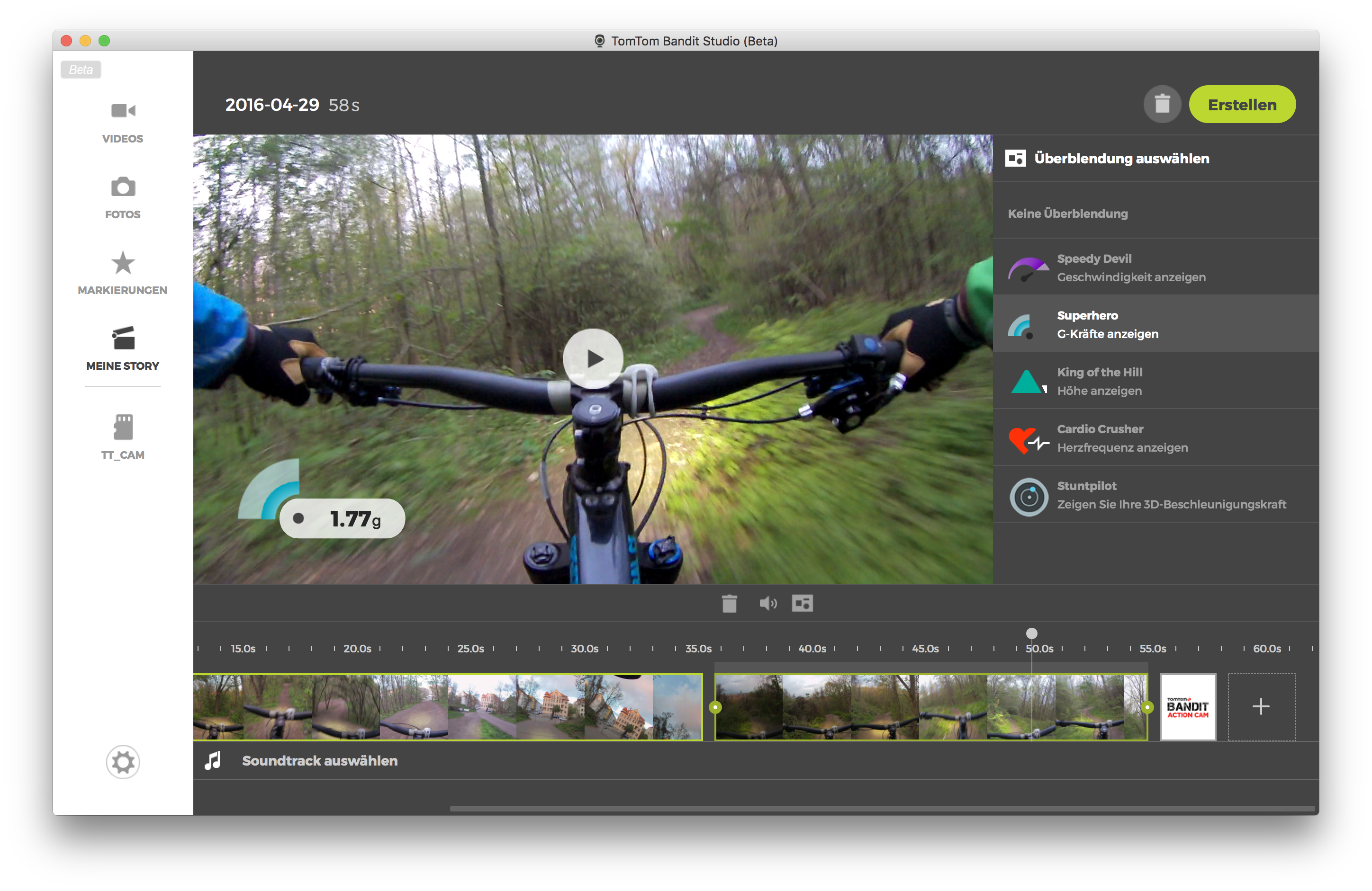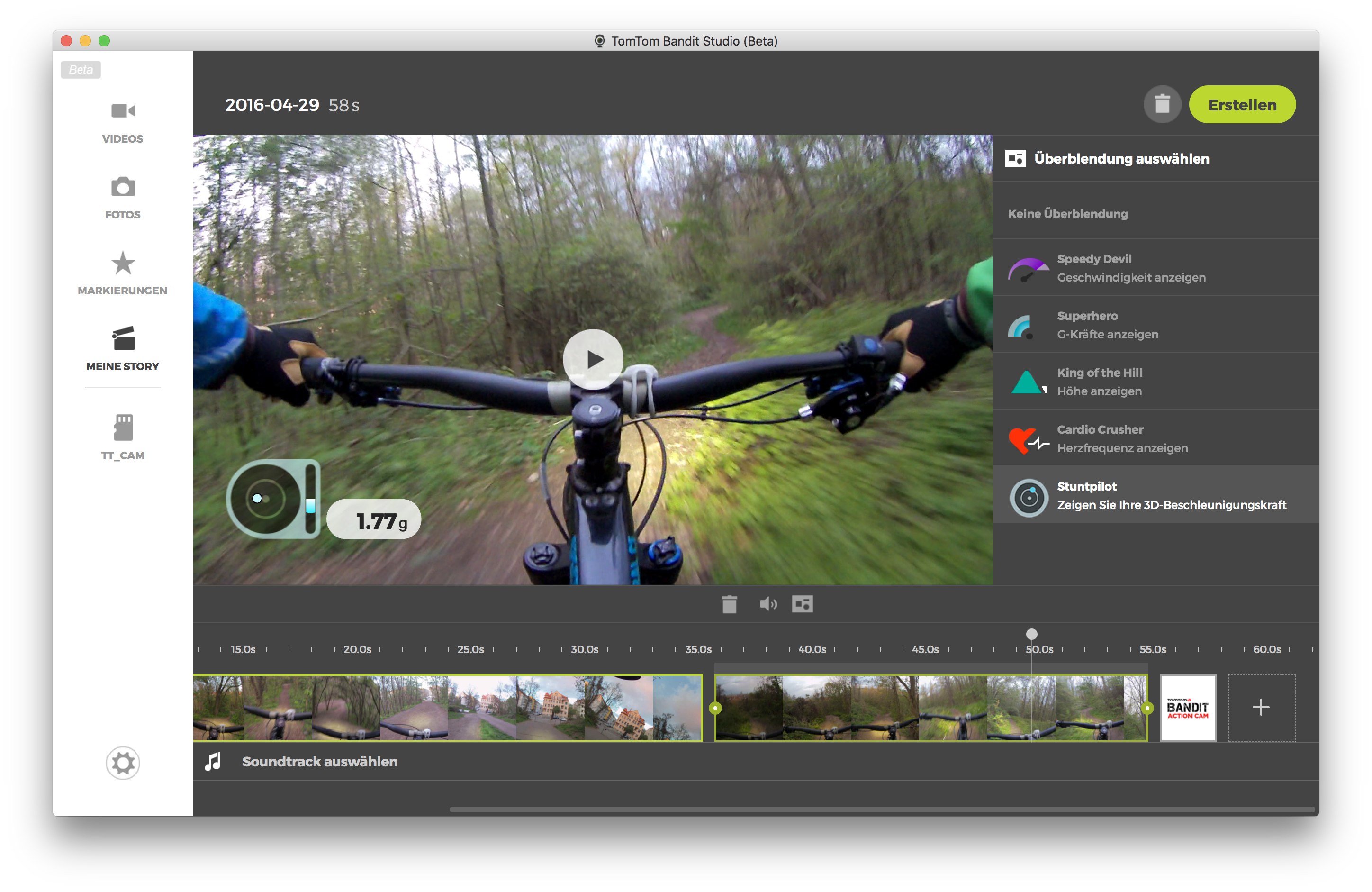 Die sich noch in der Betaphase befindliche Software haben wir auf einem Mac getestet. Diese konnte aber bei weitem nicht den positiven Eindruck der App fortführen. Zum Anschauen der Videos und Fotos mag sie noch brauchbar sein, wenn es aber darum geht aus seinem Material ein Video zu schneiden fällt schnell auf, dass das Konzept mit den per GPS gesetzten Highlights nur bedingt funktioniert. Nicht nur das man für simpelste Dinge (Highlights setzen und löschen) zwischen mehreren Menüs hin und her springen muss, auch ist das Schnittprogramm nur darauf ausgelegt eben jene Highlight-Schnippsel zu verwerten. Wenn diese dann dicht an dicht in einem Film kommen kann es auch schon mal sein, dass man ein und die selbe Stelle mehrfach sieht. Wenn man das dann ausbügeln will, fällt auf wie bescheiden man die Highlights innnerhalb eines Videos bearbeiten kann, da man auch keinen Timecode hat nach dem man sie ausrichten könnte. Zumal sich Bilder auch nicht einbauen lassen. Unterm Strich bleibt hier nur eines: Wer auch nur ansatzweise kleine Videos für Youtube etc. basteln will, sollte sich eine andere Software besorgen. Als sinnvollstes Feature bleibt da noch das exportieren der GPS Daten aus den Videos bzw. das Einbauen der GPS Daten als Overlay in ein Video. Die Nutzbarkeit der GPS Daten kommt hier bei Weitem nicht an den Umfang der Garmin Virb XE ran.