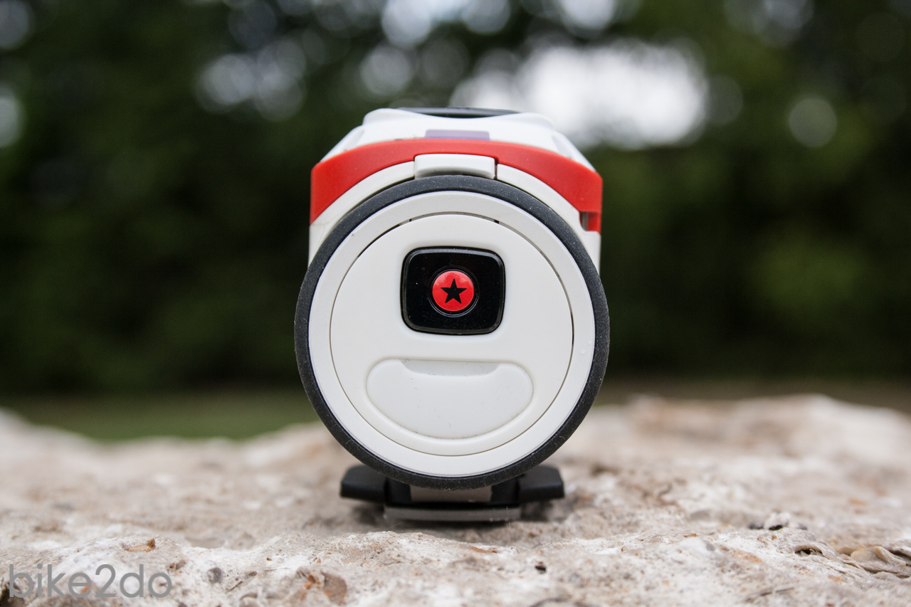 Im ersten Moment erinnert die Bandit sehr stark an die Actioncams von Contour – wer sich an die noch erinnert. Der Aufbau ist also eher langgezogen wie eine Zigarre. Das bringt im Vergleich zur GoPro-Kastenform Vor- aber auch Nachteile mit sich, auf die wir später eingehen werden. Die Befestigung der Kamera wird auf der Unterseite mit einer drehbaren Plattform samt Klick-Mechanismus ermöglicht. Die Kamera ist dadurch um 180° Grad um ihrer Längsachse drehbar und das ohne sie von der Halterung zu lösen. Im Grunde also eine Hardware-Version einer gängigen Softwarefunktion: das Kamerabild kann bereits durch die Rotation des Gehäuses auf der Halterung gedreht werden. Zum anderen ermöglich das aber auch kreative Blickwinkel für Filmemacher. Die Größe der Bandit fällt leider nicht gerade kompakt aus, was man auch am Gewicht merkt – 190 g sind kein Leichtgewicht. Eine GoPro Hero 4 Black Edition zum Vergleich wiegt inkl. Gehäuse nur 152 g. Im Fall der Bandit kommt das Gewicht aber nicht einmal hauptsächlich vom großen 1900 mAh Akku. Schon der Kamera-Body ist vergleichsweise schwer. Das Mehr an Gewicht geht im Hinblick auf die zu erwartende Laufzeit aber gerade noch in Ordnung, da man sich ja wiederum die Zusatzakkus spart. Optisch bietet die Kamera eine F2,4 Blende bei einer Brennweite von 3,1 mm. Als Marktnovum unter den bekannteren Herstellern verwendet TomTom einen 16 Megapixel Sensor. Was der zu leisten im Stande ist, werden wir im Bildvergleich aufzeigen. Die Bedienung der Bandit erfolgt über ein Steuerkreuz, eine Start und eine Stopptaste. Dabei ist die Starttaste während der Aufnahme auch gleichzeitig ein Highlight-Button, den man bei Bedarf kurz drückt, um den entsprechenden Abschnitt für die Nachbearbeitung zu markieren. Das Display auf der Kameraoberseite ist locker doppelt so groß wie das kleine Menüdisplay auf der Vorderseite einer GoPro, hervorragend ablesbar und gut platziert. Direkt drumherum befindet sich das Steuerkreuz. Die Starttaste ist an der Rückseite der Kamera angebracht. Der Stoppknopf liegt dagegen am vorderen Ende der Kamera direkt über der Linse.